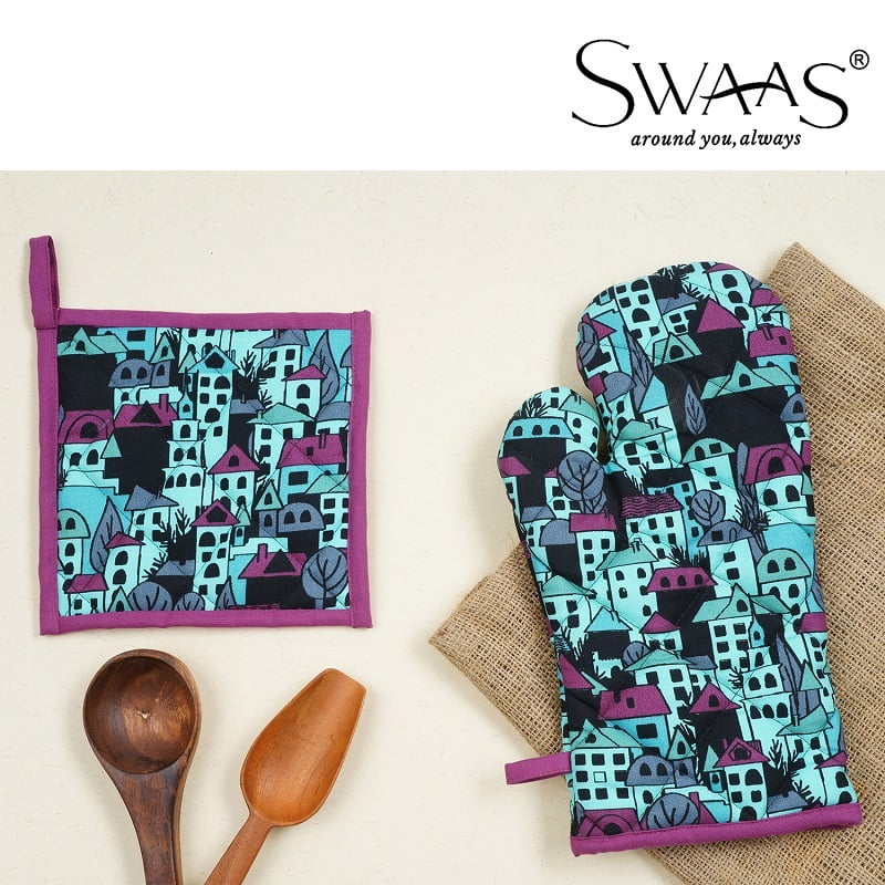 Swaas products are made from 100% cotton. The Swaas oven mitt with sturdy construction will act as a protective layer between your delicate hands and anything hot, like a pan or something to be taken out of the oven, while looking great doing it. The pot holder in a coordinated finish can be used to protect your table or other surfaces from getting stained due to the heat from the pot. Get a matching apron from Swaas as well to complete the coordinated look. The building blocks pattern is very elegant, and this particular set is finished in a deep blue colour.
