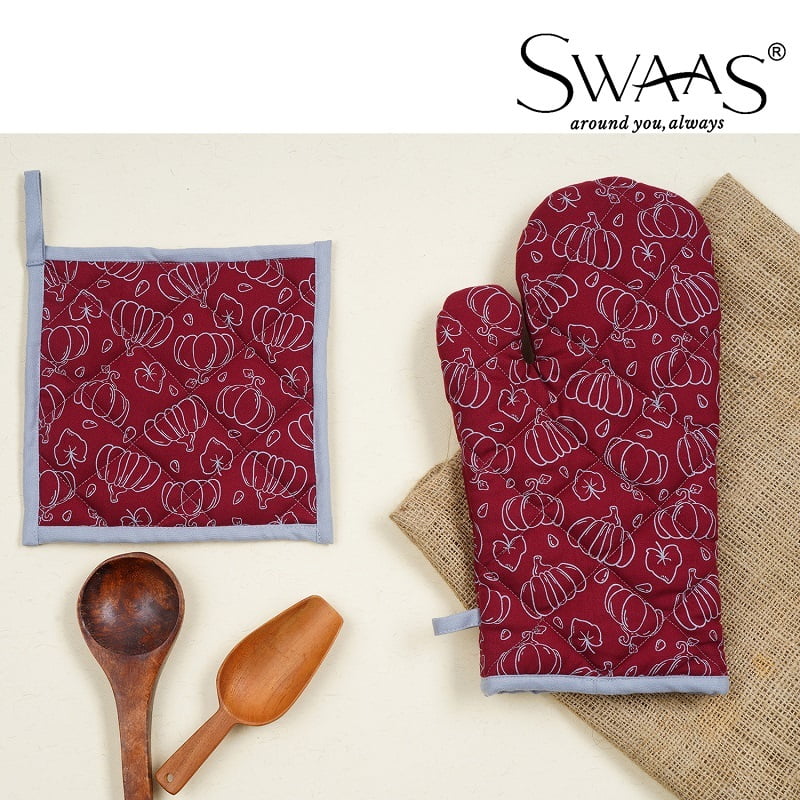 The design of these printed pumpkin outlines will go well with any kitchen decor. Our products are made from 100% cotton. The Swaas oven mitt with sturdy construction will act as a protective layer between your delicate hands and anything hot, like a pan or something to be taken out of the oven, while looking great doing it. The pot holder in a coordinated finish can be used to protect your table or other surfaces from getting stained due to the heat from the pot. Get a matching apron from Swaas as well to complete the coordinated look.